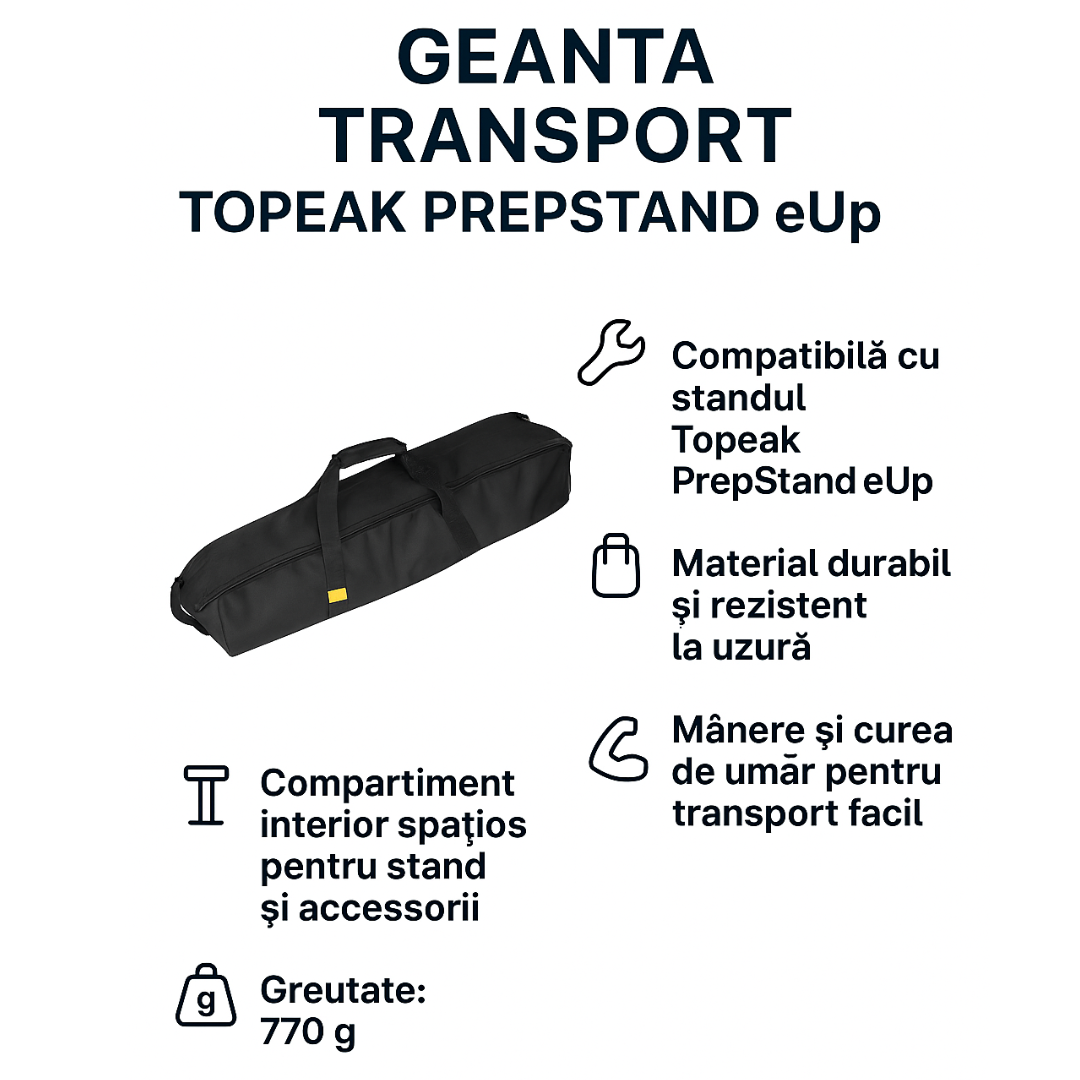 Geanta transport pentru stand bicicleta Topeak PrepStand eUPGeanta Topeak PrepStand eUP este accesoriul esential pentru transportul si depozitarea in siguranta a standului tau de intretinere. Proiectata special pentru modelul PrepStand eUP, aceasta geanta ofera protectie excelenta si faciliteaza manevrarea echipamentului oriunde ai nevoie sa il folosesti.De ce sa alegi Geanta transport pentru stand bicicleta Topeak PrepStand eUP? Compatibilitate dedicata: Conceputa special pentru standul de service Topeak PrepStand eUP Protectie sporita: Material rezistent ce protejeaza impotriva zgarieturilor, socurilor si umezelii Transport facil: Curea de umar si manere pentru transport confortabil Depozitare sigura: Inchidere cu fermoar si interior bine compartimentat Design compact: Forma adaptata dimensiunii standului pentru economie de spatiuBeneficii cheie: Material durabil: Construit din tesatura rezistenta la uzura si umiditate Usor de curatat: Suprafata simplu de intretinut, ideala pentru ateliere si transport frecvent Portabilitate excelenta: Dimensiune si greutate reduse, ideala pentru deplasari Design profesional: Estetica potrivita cu restul echipamentului Topeak Functionalitate extinsa: Poate fi utilizata si pentru alte accesorii compatibile de dimensiuni similare Caracteristici principale: Compatibilitate: Topeak PrepStand eUP Material: Tesatura rezistenta la apa si uzura Sistem transport: Curea pentru umar si manere laterale Inchidere: Fermoar robust pe toata lungimea Greutate: aproximativ 770 g Utilizare: Transport si depozitare stand biciclete Geanta transport pentru stand bicicleta Topeak PrepStand eUP este solutia ideala pentru ciclistii si mecanicii care doresc siguranta, organizare si portabilitate atunci cand isi muta sau depoziteaza standul de lucru. Alege protectia potrivita pentru echipamentul tau si bucura-te de confort si ordine in fiecare deplasare.